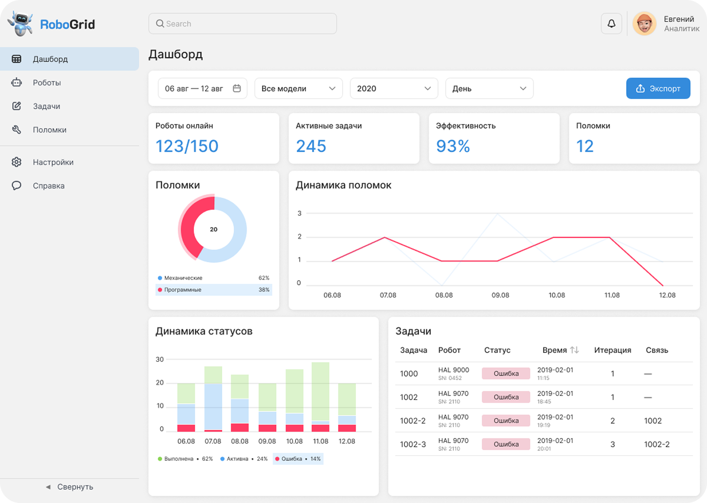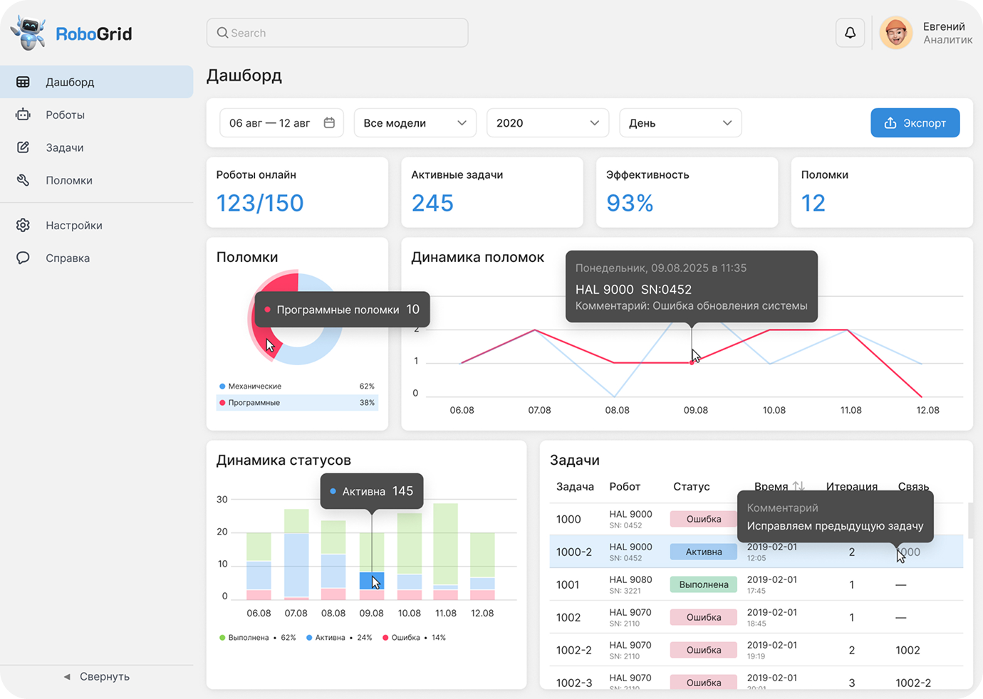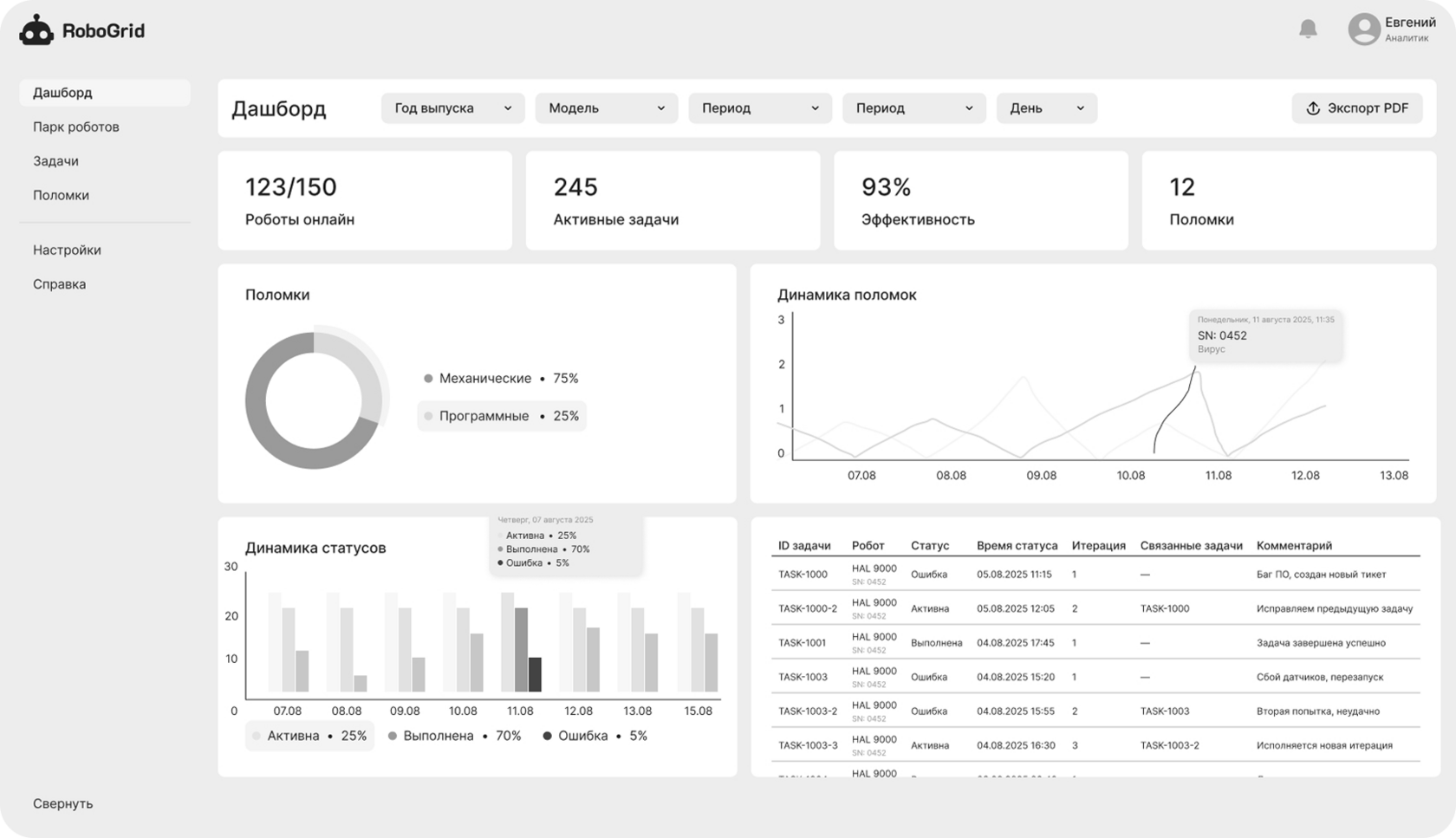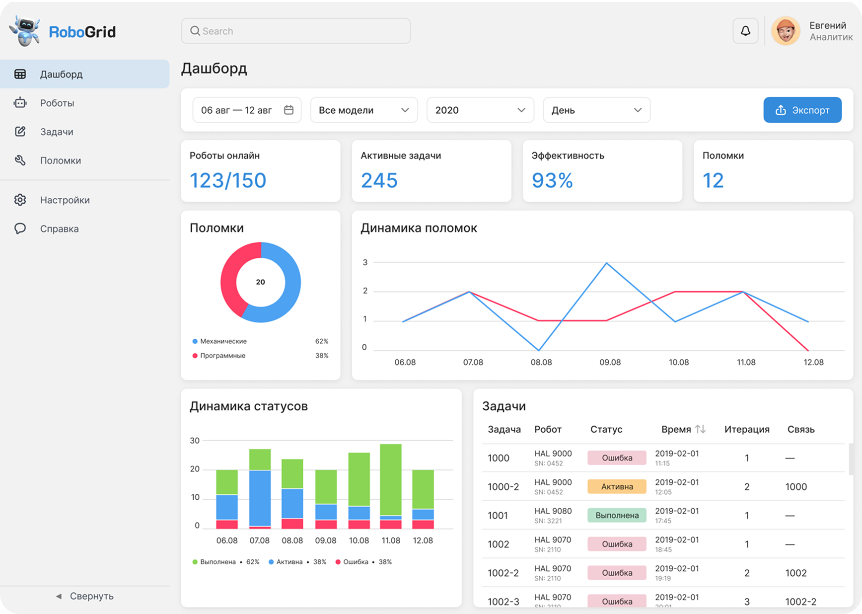 Использует дашборд для анализа поломок и загрузки парка роботов