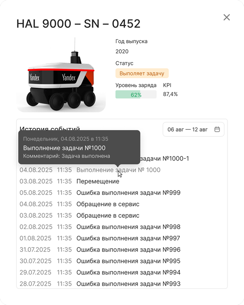 Когда я проверяю эффективность флота за период, я хочу видеть % успешных задач и доли ошибок, чтобы оценить производительность роботов.